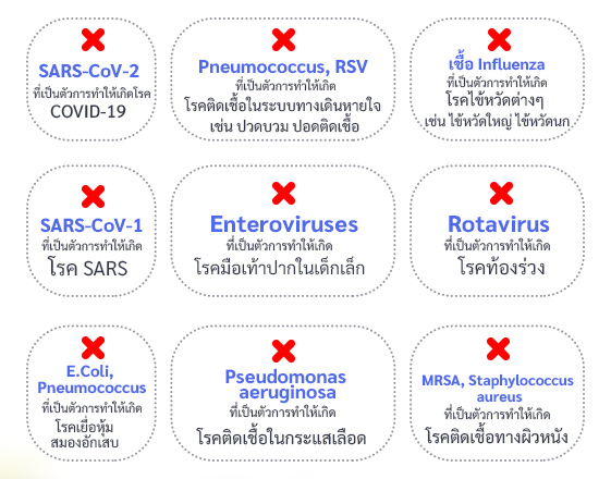 สามารถฆ่าเชื้อไวรัส COVID-19, RSV, Rotavirus, เชื้อที่ทำให้เกิดโรคมือเท้าปากเปื่อย, SARS, MERS, ไข้หวัดสายพันธุ์ต่างๆ และไวรัสอื่นๆ (และมีผลทดสอบกับเชื้อโรคต่างๆ อีกหลายชนิด สามารถกำจัดได้ทั้ง ไวรัส แบคทีเรีย และเชื้อรา)